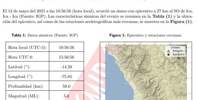 El 12 de mayo del 2021 a las 10:56:56 (hora local), ocurrió un sismo con epicentro a 27 km al SO de Ica,...
