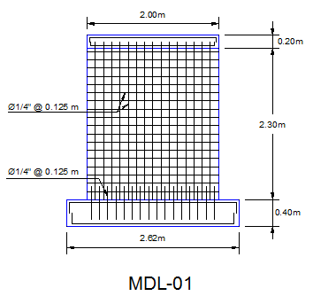 Geometría: El muro es de 2.00 m de largo, 2.30 m de altura y 0.10 m de espesor. Como refuerzo se usó una malla formada por varillas de acero corrugado de 1/4″ de diámetro espaciadas cada 12.5 cm (en ambos sentidos).