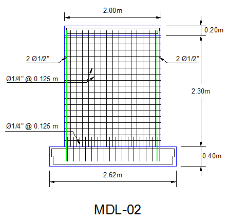 Geometría: El muro tiene 2.00 m de largo, 2.30 m de altura y 0.10 m de espesor. Como refuerzo se usó una malla formada por varillas de acero corrugado de 1/4″ de diámetro espaciadas cada 12.5 cm (en ambos sentidos). Además, se añadió 2 varillas de 1/2″ en cada extremo.