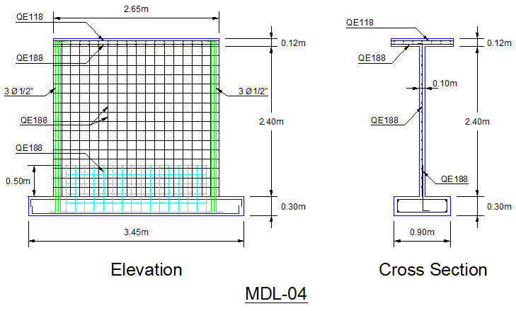 Geometría: El muro tiene 2.65 m de largo, 2.40 m de altura y 0.10 m de espesor. Como refuerzo se usó la malla electro soldada QE188 (?6.0mm @ 0.15m). Además, se añadió 3 varillas de 1/2″ en cada extremo.