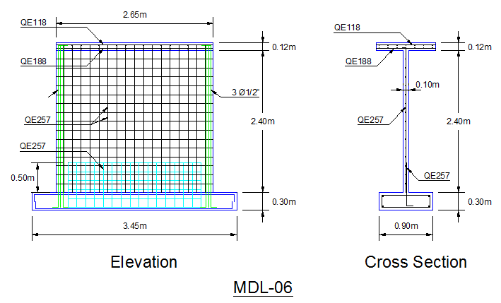 Geometry: The wall was 2.65 m wide, 2.40 m high and 0.10 m thick. An electro-welded mesh QE257 (?7.0mm @ 0.15m) was used as the steel reinforcing. Besides, three reinforcing bars of 1/2″ diameter were added at the ends.
