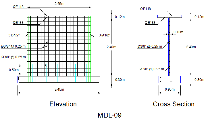 Geometría: El muro tiene 2.65 m de largo, 2.40 m de altura y 0.10 m de espesor. Como refuerzo se usó una malla formada por varillas de acero corrugado de 3/8″ de diámetro espaciadas cada 25 cm (en ambos sentidos). Además, se añadió 3 varillas de 1/2″ en cada extremo.