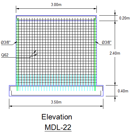 Geometría: El muro tiene 3.00 m de largo, 2.40 m de altura y 0.10 m de espesor. Como refuerzo se usó la malla electro soldada Q62 (?2.8mm @ 0.10m). Además, se añadió 2 varillas de 3/8″ en cada extremo.
