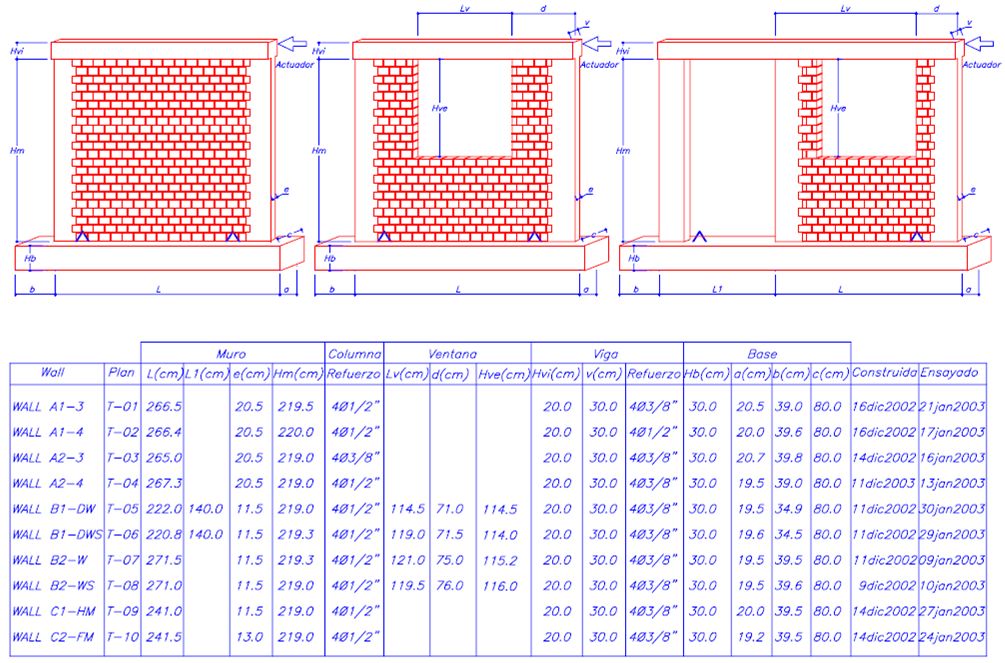 Características: Se ensayaron estructuras de albañilería confinada con aparejo de soga. Los especímenes se ensayaron sometiéndolos a cargas laterales cíclicas.