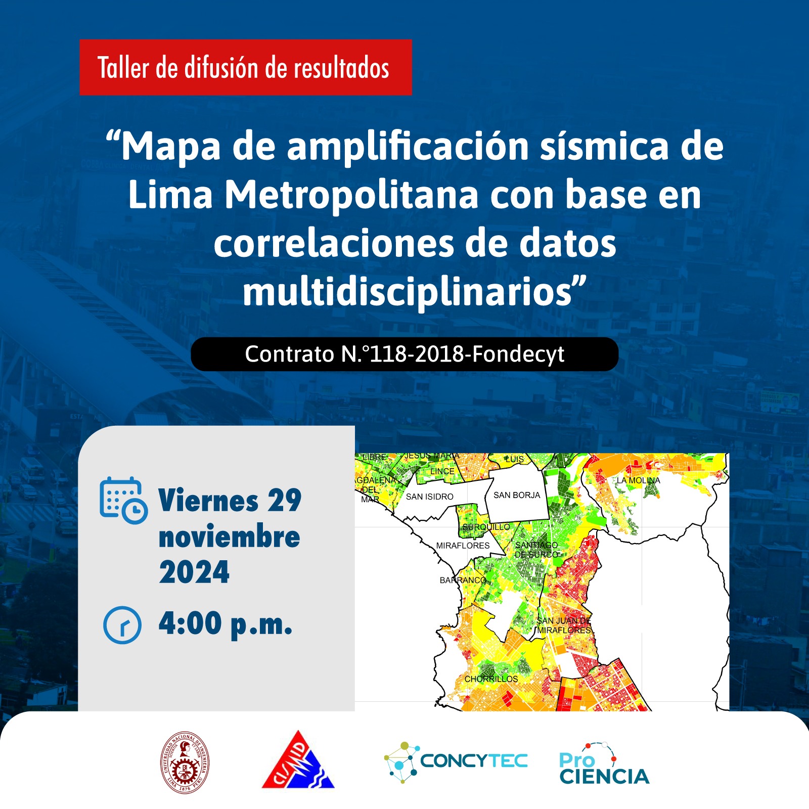 El CISMID te invita al taller de difusión del proyecto 118-2018 – PROCIENCIA: “Mapa de amplificación sísmica de Lima Metropolitana con base en correlaciones de datos multidisciplinarios”, desarrollado por nuestros investigadores.
